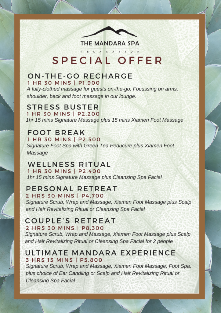 The ultimate healing massage therapy combo to rid-off muscle spasm or “lamig” as known to Filipinos, followed by a deeply relaxing Signature Massage. Feel your temsed muscles and stress melt away as your therapist slowly apply heat pads and perform Mandara’s carefully curated signature massage techniques while using organic olive massage and essential oils.